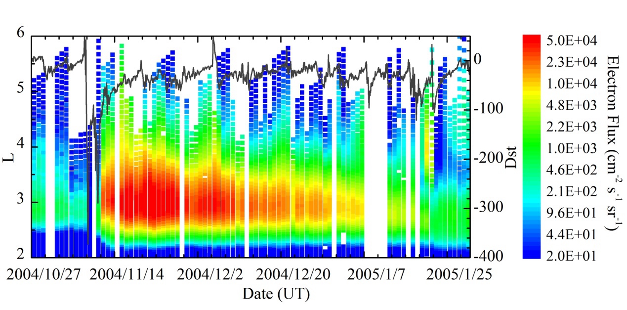 相对论电子具有很高能量(>1MeV),能够直接穿透各种航天器的表面材料,产生内部静电放电,造成航天器部件损坏。地球磁层空间中存在着大量电子,在适当机制的激发下,这些电子被有效地加速到相对论量级,导致空间中相对论电子通量呈现数量级的增长,此时,在轨运行的航天器内部静电放电风险将急剧增加,严重时,可能导致航天器失效。因此,外辐射带相对论电子增长一直被认为是地球空间威胁航天器在轨安全的最主要因素之一。在理论研究方面,外辐射带相对论电子的演化在日-地能量耦合中扮演着重要的角色。因此,对相对论电子加速机制的研究兼具工程和科学的价值。
