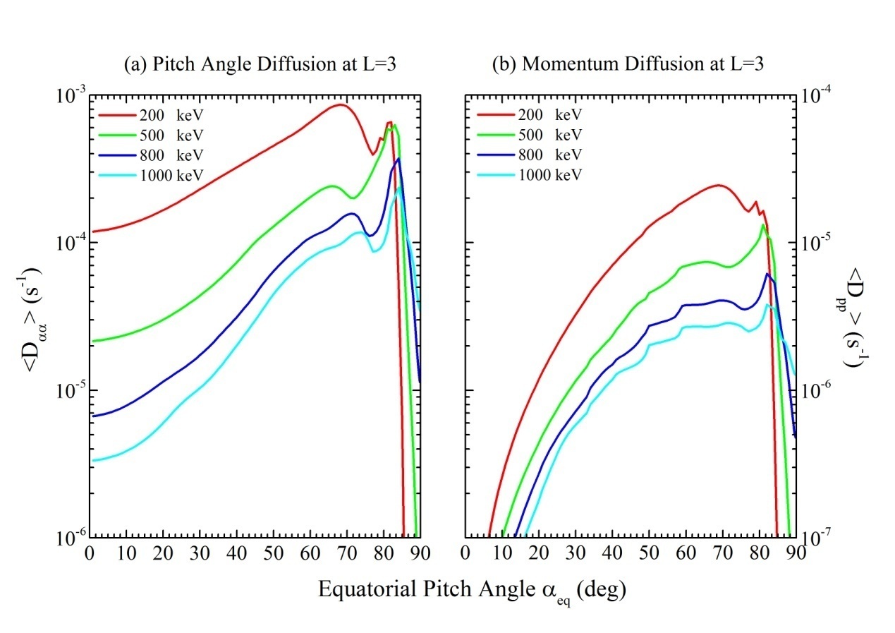 文章还用径向扩散加速效率以及哨声模和声波共振加速效率数值计算的结果证明,哨声模和声波与能量电子相互作用是导致这次“槽区”相对论电子增长的主要机制。结合通量衰减时间特性的分析和hiss共振损失效率的数值计算结果,该研究成果认为相对论电子与等离子体层顶内hiss和EMIC波动共振导致的缓慢损失,是该区域相对论电子能够长时间存在的原因。