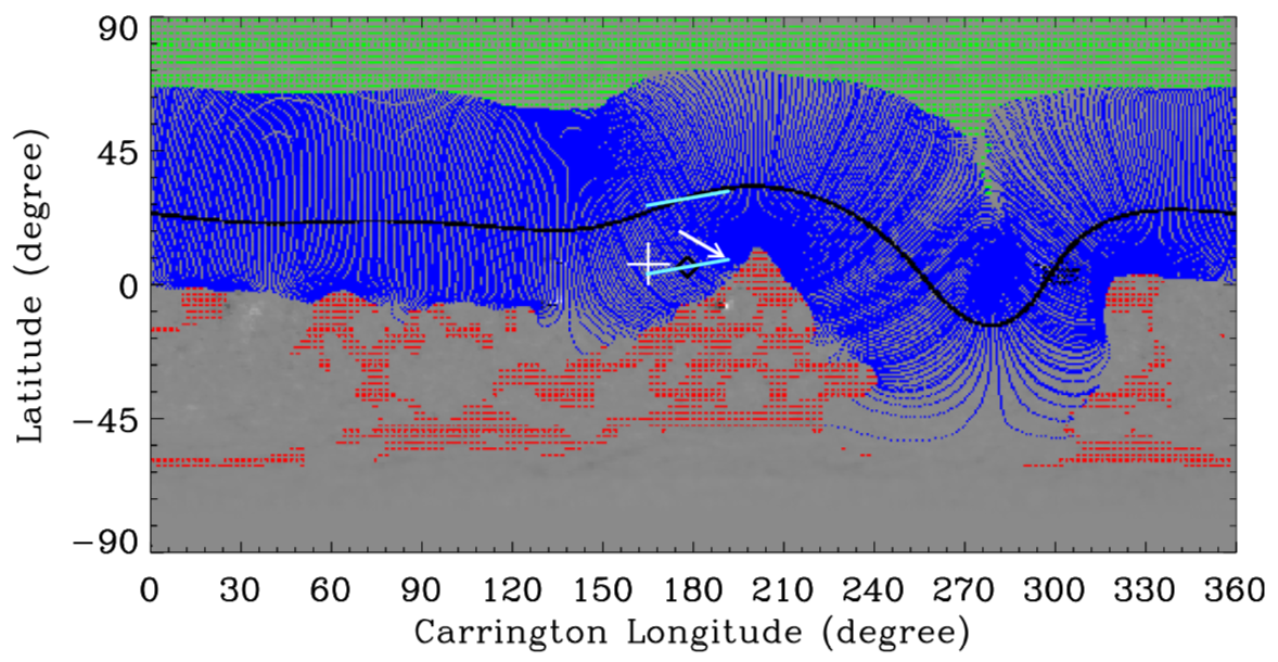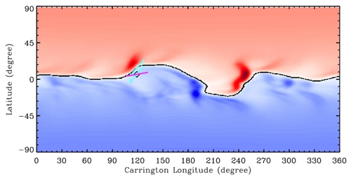 图二:磁流绳方向与日冕(上)、1 AU处(下)的日球层电流片比较。