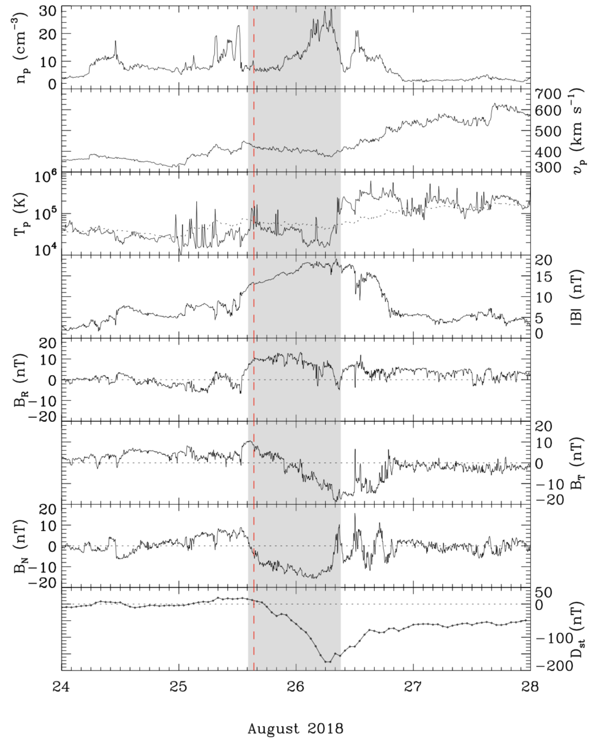 刘颍团队结合多种卫星数据和方法,对此弱CME从日冕到1 AU的整个传播过程进行了追踪和分析。研究发现,此CME是由一个宁静区暗条的缓慢爆发产生,其产生的微弱耀斑持续时间竟然长达24小时!CME随后进入快慢太阳风之间的压缩区,其膨胀被抑制,致使其内部磁场增强。研究还揭示,CME的磁流绳在低日冕和行星际空间中都发生了旋转,并且倾斜角度倾向于和当地的日球层电流片相一致(图2)。当CME到达地球时,其内部的增强磁场以及南向的磁流绳轴向磁场造成了意想不到的强烈地磁暴(图3)。此项研究表明,即使在较弱的太阳活动周,慢速CME与快速太阳风相互作用仍然可以产生很强的地磁效应。