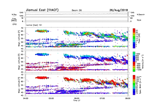 图1. 2018年8月26日0400 UT-0800 UT佳木斯雷达第6个波位上观测的回波功率,多普勒速度和谱宽。