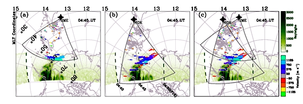 图2. 在0445UT佳木斯雷达(JME)与日本北海道东(HOK)雷达的同时观测,背景叠加了DMSP卫星SUSSI的极光观测图像。