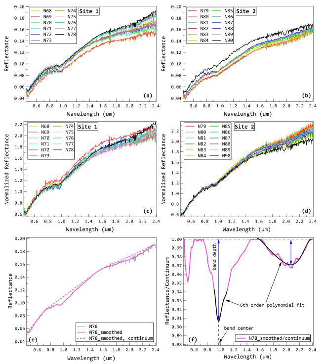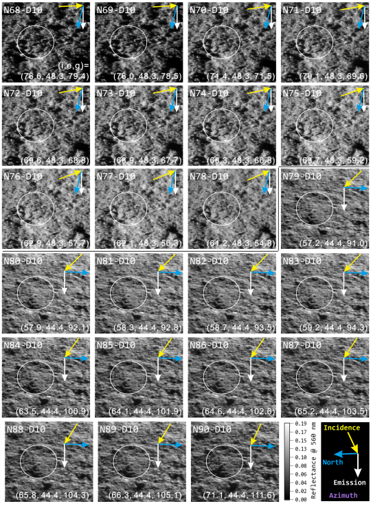 图二:玉兔2号对月表同一区域进行了连续的光谱图探测,获取了不同观测几何角度下的反射光谱(Yang et al., 2020)