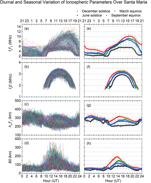 图二:巴西圣玛利亚地区电离层参数日间和季节性变化。其中(a)~(d)分别是圣玛利亚台站数字测高仪foF2,foE,hmF2和B0等参数单日叠加图;(e)~(h)分别是十二月份(红),三月份(绿),六月份(黑)和九月份(蓝)的foF2,foE,hmF2和B0参数月平均值