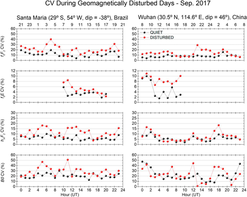 图三:2017年9月地磁风暴干扰剧烈活动期(红)和平静期(黑),巴西圣玛利亚地区和中国武汉地区的foF2,foE,hmF2和B0参数的评估变化系数(CV)