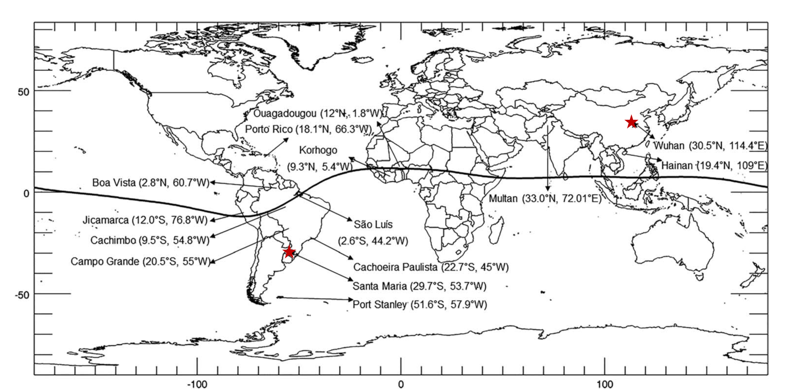 图一:全球部分电离层数字测高仪站点分布图(图中红五星标注的台站位置分别为巴西圣玛利亚站和中国武汉站)