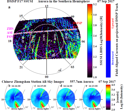 图二:DMSP卫星与我国南极中山站极光观测图像。图像被投影在地磁与磁地方时坐标系中,是从南极上空往下看的效果。