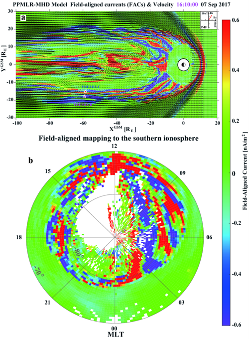 图三:该事件期间,中国科学院国家空间科学中心三维磁流体力学模拟的场向电流在磁层磁赤道面内的分布及其沿磁力线在南极电离层的投影。