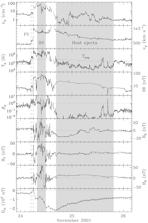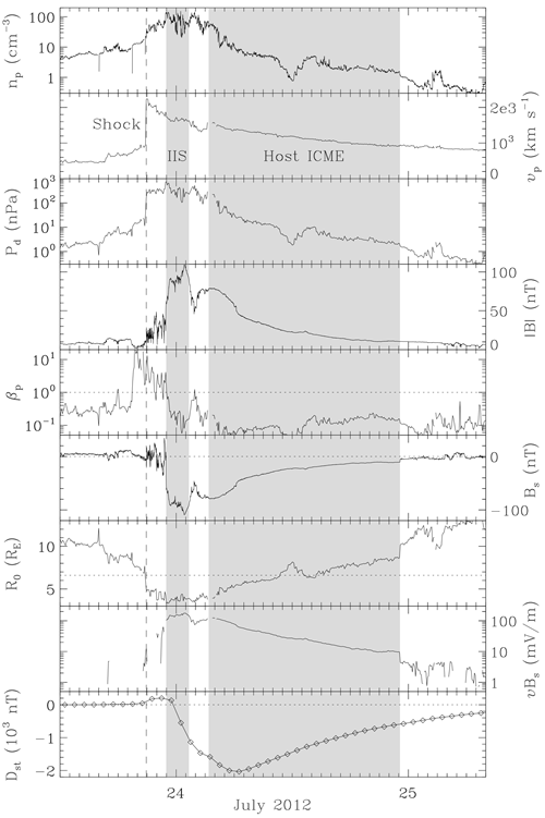图二:STEREO A观测到的ICME-in-sheath(IIS)和宿主抛射物,具有超强的磁场、速度和密度。