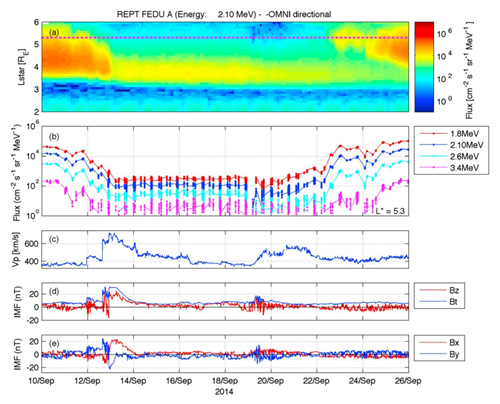 图一:REPT观测到的相对论电子(2.10 MeV)全向通量和L *参数(a);L *5.3 RE处四个能道的电子通量(b);拉格朗日点L1处的太阳风速度Vp(c);IMFBt及其南北分量Bz(d);IMFBx和IMFBy分量(e)。