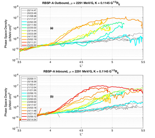 图二:范艾伦探针卫星在不同轨道相观测到的高能电子相空间密度径向分布及其时间演化