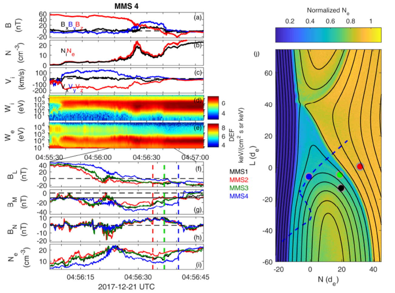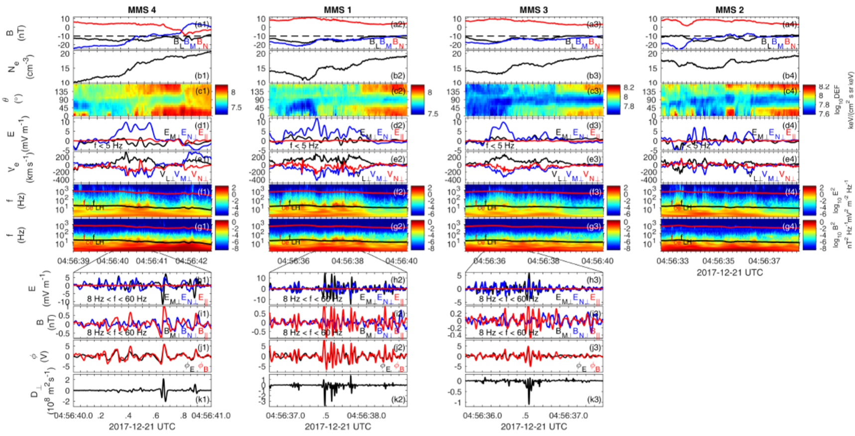 观测到的低混杂波沿着电子运动方向(电子的电场漂移和梯度漂移方向相同)传播,这与非对称引导场重联中x线的抗磁漂移方向一致。由于低混杂波的相速度大于x线的漂移速度,当低混杂波传播到重联x线附近后物理过程值得进一步关注。同时低混杂波还能够有效引起等离子体从磁鞘到重联出流区的扩散输运,从而有助于我们深入理解重联过程中的物质传输过程。 论文链接