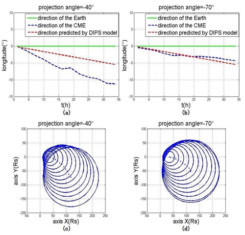 共转相互作用区(CIR)是太阳风中的一种重要的结构,当快速CME传播在行星际空间中,与CIR发生相互作用时,也会改变原有的传播路径。因此,对CIR影响下的CME偏转过程进行数值模拟研究是十分重要的。沈芳团队的博士生刘佑生等人基于GCS模型构建了一种新的三维CME磁绳模型(如图2),模拟了快速CME在行星际空间的传播及偏转过程。结果表明:当快速CME在行星际空间传播时,其传播方向会向东偏转;当其与西侧的CIR发生相互作用时,由于受到CIR的阻碍,其偏转情况跟前者相比会有所加剧(图2),图2(a)和(c)表示有CIR作用情况下快速CME的偏转,图2(b)和(d)表示没有CIR作用情况下快速CME的偏转。相关工作发表于The Astrophysical Journal杂志.