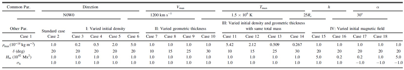表 1:不同初始密度、初始几何形状、初始总质量和初始磁场的18组CME事件的具体初始参数设定