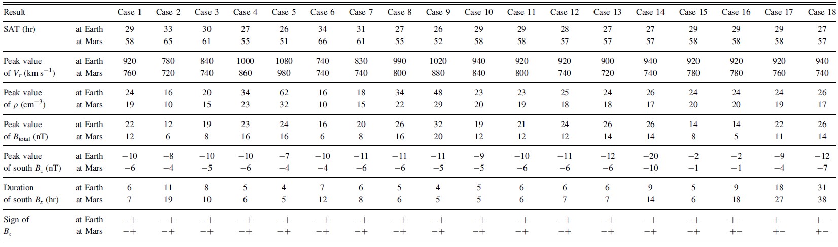 该模拟工作主要针对初始CME传播方向沿着日地连线的情况下展开,选取了卡林顿周2093时位于地球和火星两个位置的结果作为研究对象,针对包括CME模型初始的密度、磁绳初始几何尺寸、总质量以及初始磁场大小和方向在内的初始参数,进行了总计18组CME事件的研究(表1),对地球和火星位置处的激波到达时间,各参数峰值及南向磁场持续时间等模拟结果进行了定量对比分析(表2)。