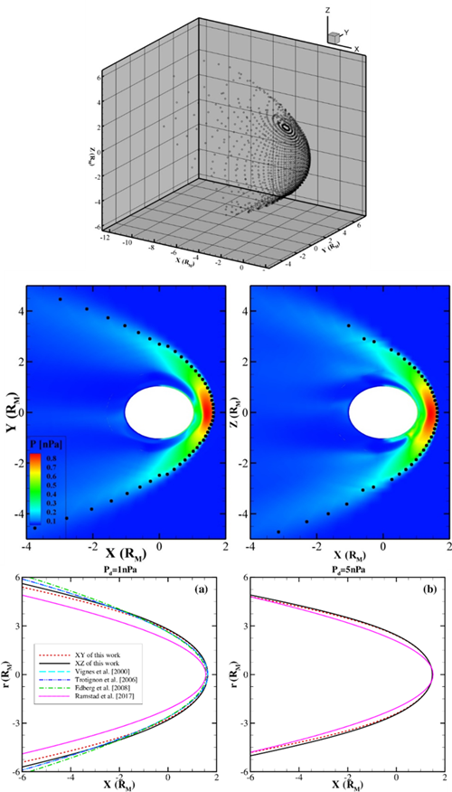 另外,借助该磁流体模型,王明、谢良海等人也对日下点处的磁堆积边界进行了研究,除了已知的太阳风动压作用外,该研究首次发现了太阳风密度和速度各自对磁堆积边界的影响,并依此提出了一个包含了太阳风动压、速度和密度等参数的火星磁堆积边界经验公式。该研究打破了人们对磁堆积边界的传统认识,为进一步探究磁堆积边界的形成机制提供了基础。该项研究成果发表在国际著名期刊 Astronomy & Astrophysics上。
