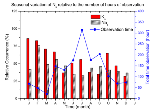 研究表明尽管钠和钾都属于碱金属原子层,但它们的突发层具有明显的差异。一般而言,突发钠层的宽度比突发钾层宽0.7公里,高度也比突发钾层高出约2公里;突发钠层的增强和耗散消失过程比突发钾层要快;两者的相对出现频率都呈现出半年度的周期变化,但稍有差异,分别在一月/十月和二月/九月达到最大值。这些差异可能与它们的光化学反应过程的差异、以及与电离层耦合过程的差异有关,还需要做进一步的观测和研究。