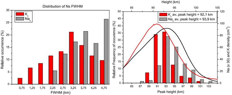 图2. 突发钠层和突发钾层的特性统计(左:半宽,右:峰值高度)