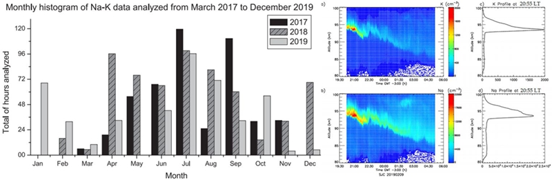 南美实验室海外博士后Vania Fatima Andrioli与中科院国家空间科学中心空间天气国家重点实验室徐寄遥研究员、巴西国家空间研究院Paulo Prado Batista教授等研究人员合作,利用南美实验室激光雷达系统对该地区上空突发钠层和突发钾层进行了观测研究。研究团队通过对2017年3月到2019年12月期间,超过1500小时的钠和钾层的观测数据进行反演,并针对突发钠层和突发钾层的出现、消散、半宽、峰值高度、强度、以及季节变化等特性进行了统计分析和研究。