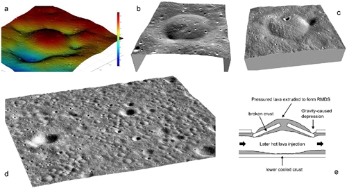 张锋研究员于2017年首次利用高分辨率遥感影像观测到此类火山地貌特征并将其命名为环形凹陷穹丘(Ring-moat Dome Structures, RMDSs),它们是以离散(图1a-1c)或成簇聚集(图1d)形式分布于火山平原上的圆形丘(类似地球上的圆形土堆),但与传统火山穹隆不同的是它们直径小(平均直径~200米,多数高度小于16米)、顶部平坦、和普遍缺少喷口且周围被凹陷地形环绕。基于比较行星学研究,它们的形成与喷发到月球表面的熔岩成分及其在月表的动力学行为(包括冷却结晶、膨胀作用、集气、减压和排气过程等)有关。火山喷发后期相对富含挥发分(特别是水)的熔岩注入到已淬火、冷却的熔岩壳下面,在月表真空和低重力环境下,里面的压强增大导致上覆冷凝壳破裂,从而引起内部减压并产生泡沫岩浆(挥发分含量较高或孔隙度较高的熔岩),在压强的驱使下泡沫岩浆沿裂隙上涌并在表面聚集,内部物质的排放和表面重力的加载导致周围地形下沉并形成环形凹陷(图1e)。