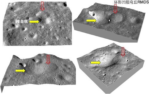 图2.高分辨率三维显示:一些环形凹陷穹丘部分填充到小型撞击坑内部。