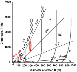 图3.地形参数测量结果得到的被环形凹陷穹丘覆盖的小型撞击坑的模型年龄,其中四个年龄<5亿年,两个10亿年左右(红色部分)。