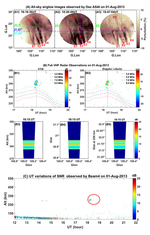 图1. (A)事件的气辉观测;(B)VHF雷达观测到的雷达回声(信噪比和多普列漂移速度)其中的蓝色和蓝绿色的水平虚线是富克VHF雷达观测到的在200-350 km之间的回声结构在气辉高度(大约250 km)的纬度投影区域。(C)地方时20点到凌晨6点之间富克VHF雷达信噪比的时间-高度分布。