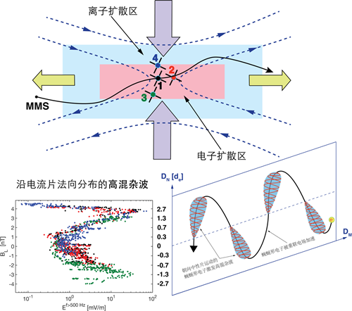 李文亚等首次在重联电子扩散区内发现电子解耦能够激发两类等离子体波动——高混杂波和电子回旋谐波。在此工作基础上,该团组对MMS在地球磁尾的海量观测数据进行了系统性搜寻,筛选出磁场重联点的一个观测事例,该重联点的电流片薄至1.4个电子惯性长度,MMS在电流片的两侧同时观测到非线性的高混杂谐波,波动振幅有显著的空间局地特征,沿电流片法向呈现“M”形分布。结合MMS/FPI仪器的高精度电子数据,研究发现该事例中的高混杂谐波只由朝向重联点运动的这部分蜿蜒形电子(meandering electrons)激发。定量分析发现高混杂谐波的能量与重联电场对蜿蜒形电子的加速能量可比,说明高混杂谐波耗散了相当比重的重联电场对电子的加速能量,由此推断高混杂波与电子的相互作用有可能限制重联电场。