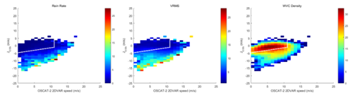 以Joss为基准(纵轴),2DVAR风场为横轴,对数据进行排序显示:颜色表示散射计观测风场单元的降水量(左图),对应区域与C波段质量接收风场的矢量差(中图)和对应的考察样本数(右图)。由图可见,Joss对降水具有很好地区分性质。