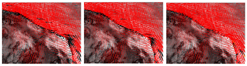 海洋2B星(HY-2B)散射计观测于2021年4月29日UTC20:00,位于北大西洋52° N, 45° W附近的风场(KNMI业务系统反演结果)。左图为使用MLE QC, 中间为使用NWP QC,右图为nowcasting QC质量控制的对应结果。质量剔除的风场以黑色箭头表示。