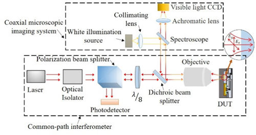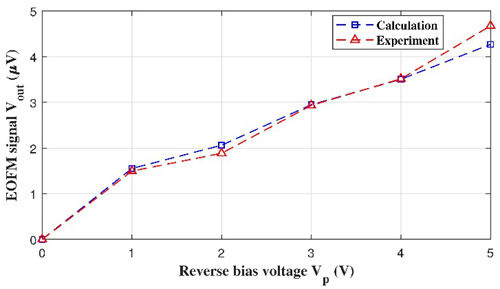 在传统的EOFM技术基础上,研究团队提出了一种新的基于同轴显微镜的定位集成电路内部功能单元的频率映射方法,自主搭建了集成电路缺陷检测电光探针测试装备,如图3所示。目标电路以设定工作频率工作,通过分析反射激光的频率特性,准确定位目标电路功能区域及可能的缺陷位置。提出的同轴显微镜设计提供了良好的光斑质量和信噪比,可定位工作电流低至10-10A的芯片内部工作区域,图4为针对某电路功能单元的定位结果,而相同功能的光发射显微镜只能定位该芯片5×10-4A的工作区域。研究团队依托自主研发的电光探针测试装备,还研究了器件电光信号的产生机制并提出一个理论模型,可精确计算器件内部节点的电压信息(图5),模型计算结果和试验结果吻合较好。相关成果已发表于国际刊物Electronics Letters和Applied Sciences上。