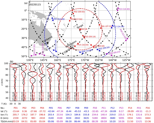 图1:汤加火山(红色五角星)后SABER的测量点分布(a)和强重力波剖面对(b)。a中彩色测量点表示振幅超过20 K的强重力波,红色和蓝色虚线分别表示距离火山2000和4000 km;b的下方标出了强重力波剖面对的位置(纬度[Lat],经度[lon],与火山之间的距离[D]和时间差[TD])。