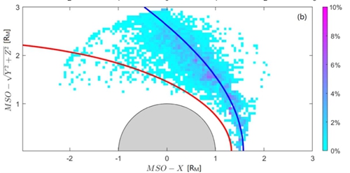 图1 火星磁鞘内的镜模结构分布(红蓝曲线分别代表磁层顶和弓激波波的平均位置)