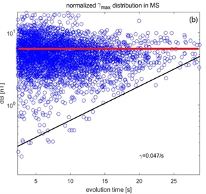 图2 镜模波幅值随演化时间的变化,大量事件处于饱和状态(红线),少量事件处于不稳定性线性增长阶段(黑线)