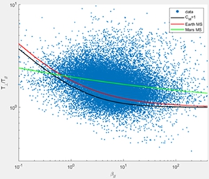 图3 磁鞘内的温度各向异性和等离子体β,火星观测值(蓝点)及拟合曲线(绿线),地球拟合曲线(红线),镜模不稳定性阈值(黑线)。