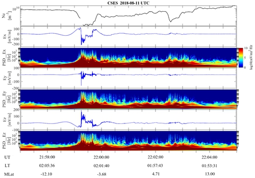 图1. CSES观测到等离子体泡内的电场ELF波动