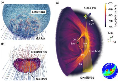 图:全球混合模拟中(a)地球弓激波的孔塞状和(b)磁层顶形变特性,SMILE卫星软X射线强度在模拟中的三维分布。