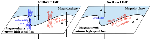 基于本文的观测结果,并对比过往的模拟工作,我们认为南向IMF期间K-H波动与磁场重联可同步发生并存在相互作用:初始时已经有较大的磁剪切角,K-H波动使得电流片变薄进而促进磁场重联的发生,在该事例中的前导边缘和后随边缘处都观测到了重联特征,进而重联则可通过出流造成的边界层加宽以及复杂的等离子体流和磁场扭结形态抑制K-H波动的进一步演化,从而导致了南向IMF条件下K-H波动较低的的观测概率。这与北向IMF下的物理过程完全不同:北向IMF下,初始时磁剪切角较小,K-H波动使得磁力线发生扭曲,在近赤道平面内形成较大磁剪切角并进一步触发间歇性重联,目前这一重联只在后随边缘被观测到。
