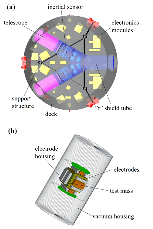 图2: (a) 太极复杂航天器模型;(b) 太极惯性传感器模型