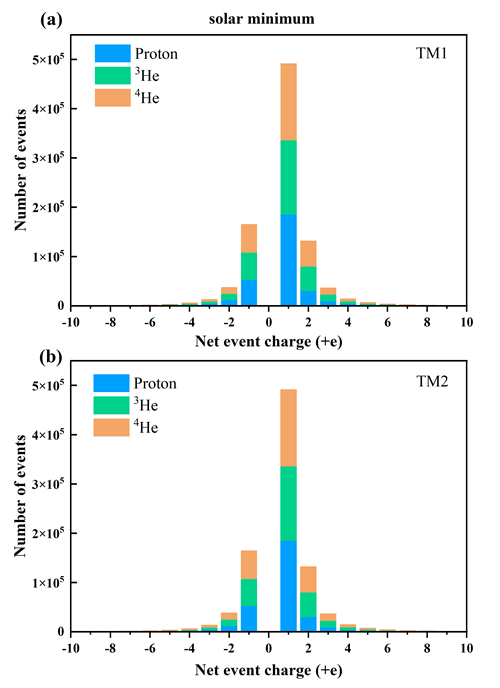 图3: 太阳极小单个粒子充电分布(a) TM1;(b) TM2