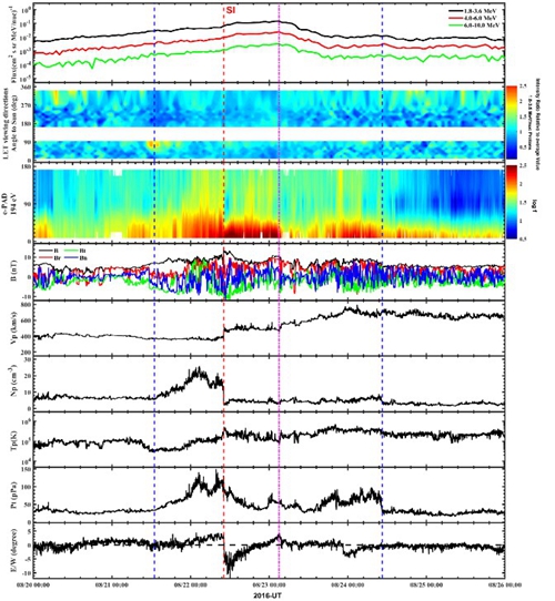 近日,中国科学院国家空间科学中心太阳活动与空间天气重点实验室沈芳研究员团队对STEREO-A在2016年8月21-24日观测到的一个与共转相互作用区有关的能量粒子事件进行了研究。通过对观测数据(见图1(a))的分析发现STEREO-A未局地观测到共转相互作用区激波的存在,不同能量的质子近似于各向同性分布,且质子通量曲线变化趋势类似。这些都表明能量质子通量的抬升可能应该归因于共转相互作用区中存在的局地加速机制。沈芳团队建立了一套耦合模型,将数据驱动的太阳风背景解析模型与描述能量粒子在行星际中传播与加速的粒子模型结合,来模拟粒子在更贴近实际的行星际空间中的传播与加速过程。使用耦合模型模拟STEREO-A所观测到的该能量粒子事件,与观测结果较为吻合,并进一步探究了该能量粒子事件形成的原因。通过模拟结果发现,粒子在共转相互作用区传播的过程中,会受到行星际磁场中“trap-like”的磁场结构的明显调制。粒子在类似磁镜的磁结构间来回散射并经历多重加速和减速的过程,是造成该能量粒子事件中粒子通量曲线抬升的主要因素。该研究对理解共转相互作用区中的粒子局地加速机制有较为重要的意义。