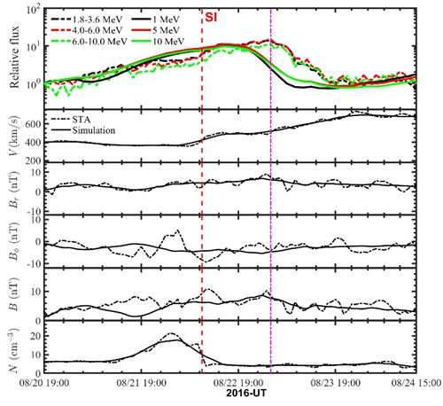 图1 (a) :STEREO-A于2016年8月21-24日观测到的与共转相互作用区有关的能量粒子事件; (b) 模拟结果(实线)与观测结果(虚线)对比