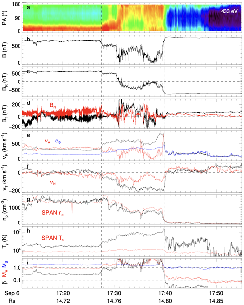 该CME发生于活动区13088(W170 S28 )。 在日冕仪成像观测中(见图1),CME呈现出复杂的结构,它要么是扭曲的单一事件,要么是由两个爆发组成的复合事件。考虑到其结构的复杂性,对该CME进行拟合将很困难,然而对其激波在两个视图中都可以通过简单的球形结构很好地拟合。对激波成像的拟合结果表明,激波的传播方向为(W170 S50 ),激波前端峰值速度为2900km/s,预测激波将于9月5日的17:39 UT到达PSP,到达时激波的法向速度将为1300 km/s。鉴于该传播方向和PSP在黄道面上的位置,PSP将从侧面穿越激波和抛射物。