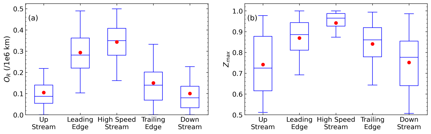近日,空间中心太阳活动与空间天气全国重点实验室王赤院士团队的李晖研究员与博士生戴凡倬通过识别1994-2024年间WIND卫星在太阳风中观测到的switchback,详细分析了switchback与周围环境的差异以及太阳风条件对其发生率和偏转程度的影响发现:(1)switchback是嵌入阿尔芬波中的结构,与周围太阳风阿尔芬性和等离子体参数没有明显差异,平均等离子体β值较低而不易导致阿尔芬波耗散;(2)switchback在大振幅阿尔芬波期间集中出现,同时阿尔芬波片段越长,switchback发生率越高,呈现出集群分布特性;(3)高速流中switchback的发生率高于速度剪切效应更强且磁力线足点移动更频繁的上升沿和下降沿,意味着速度剪切和磁力线足点移动并非主要机制;(4)因为磁压缩性较强而被排除的潜在事件具有较高的β值,同时阿尔芬波较周围出现明显衰减,可能是参数增长率不稳定性导致阿尔芬波耗散的产物。