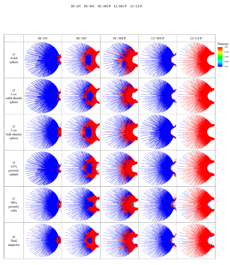 近日,中国科学院复杂航天系统电子信息技术重点实验室的刘晏东博士(第一作者)、周琪博士(第二作者)和李明涛研究员(通讯作者),基于小行星防御试验任务需求,使用了对大变形、冲击载荷问题具有良好适应性的光滑粒子流体动力学(SPH)方法,研究了动能撞击防御小行星中不同撞击器建模方式对撞击响应仿真结果的影响。考虑6种不同的撞击器仿真建模方式(如图1),分析了以5 km/s撞击30 m直径单体岩石小行星时产生的撞击响应(如图2)。同时,小行星参数考虑了5类情况,分别为:高内聚力、高抗拉小行星(HC-HT);高内聚力、中抗拉小行星(HC-MT);高内聚力、中抗拉、孔隙小行星(HC-MT-P);低内聚力、中抗拉、孔隙小行星(LC-MT-P);低内聚力、低抗拉、孔隙小行星(LC-LT-P)。