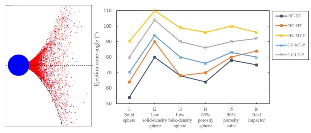 在溅射物喷出角方面,实心铝球简化建模相比真实撞击器建模会使喷出锥角明显偏低,而低固体密度铝球简化建模会使喷出锥角明显偏高。低堆积密度铝球和孔隙率在63%~90%间铝球简化建模产生的溅射物喷出锥角则更接近真实撞击器。