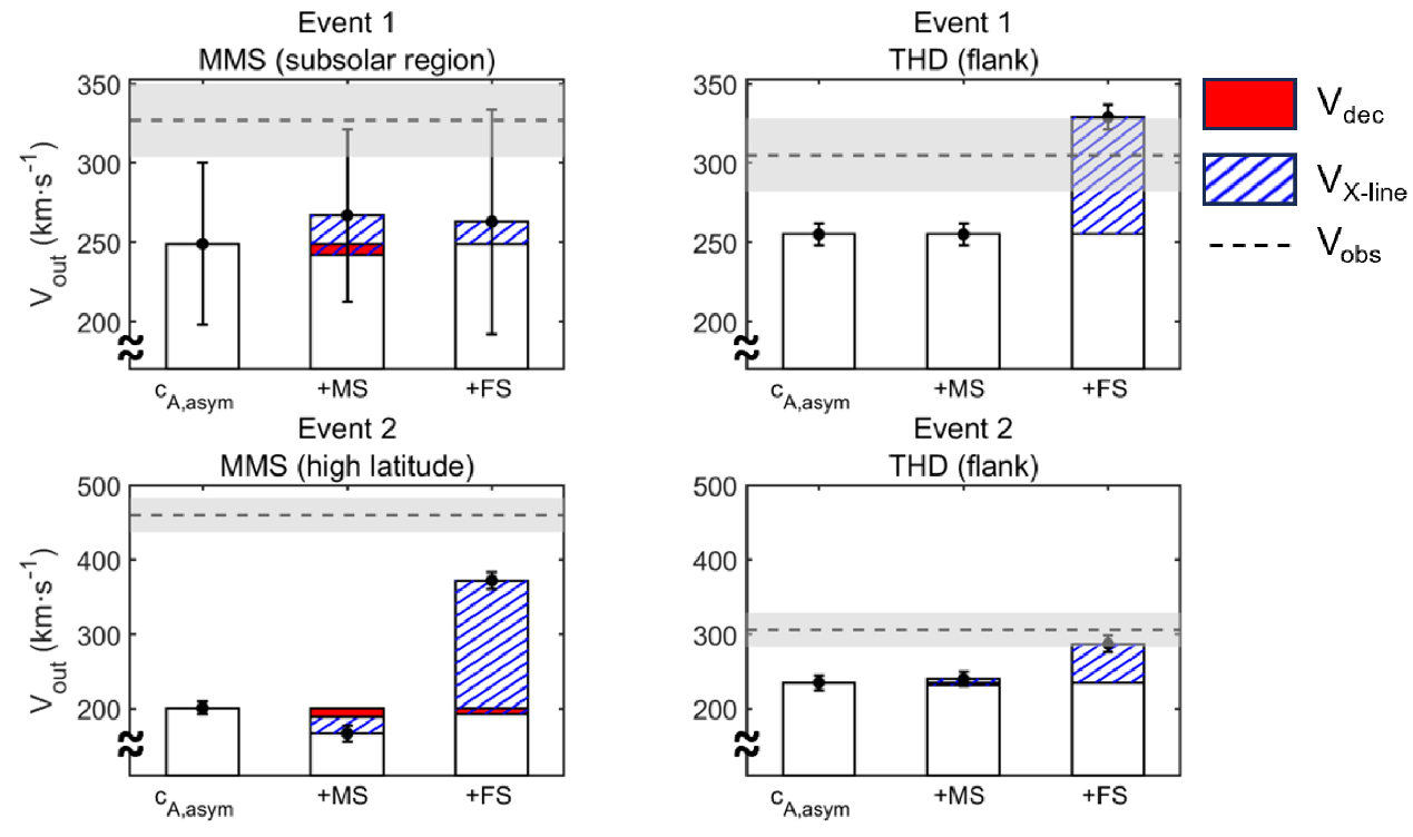 中国科学院国家空间科学中心太阳活动与空间天气全国重点实验室的研究团队联合中国科学技术大学等,利用磁层多尺度任务卫星(Magnetospheric Multiscale, MMS)与亚暴中事件的时间历程与宏观尺度相互作用任务卫星(Time History of Events and Macroscale Interactions During Substorms, THEMIS)在磁层顶大尺度范围内不同区域的多点同时观测数据,从2015年至2023年的观测中筛选出两个典型事件,分别覆盖了磁层顶的典型区域,包括日下点、侧翼和高纬地区。通过观测中磁层顶重联的上游参数,分析并对比了磁剪切与流剪切效应。结果如图1所示,在两个观测事例中,考虑磁剪切或流剪切的影响后,理论预测的重联出流速度均与观测速度更加接近。对比结果显示,磁剪切在观测中对重联出流速度的影响相对较弱,而流剪切在高纬磁层顶可以通过产生较大的重联点漂移速度来影响观测中的重联出流速度。