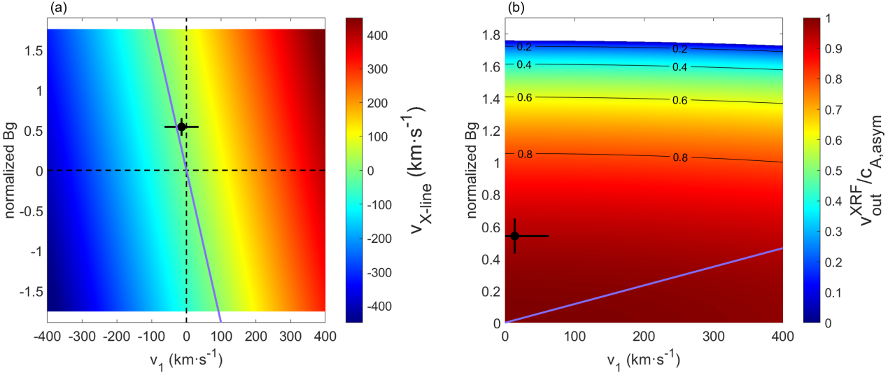 图2. 磁剪切与流剪切共同作用时对重联出流速度影响(基于重联点漂移速度为两种剪切效应叠加的假设)。