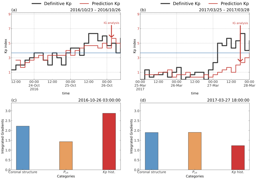 在团队前期的研究中,已将改进的积分梯度算法(Integrated Gradients, IG)应用于“解释”L1点实测数据中对Kp指数贡献最大的参数,最终结论与前人的理论研究一致,验证了算法的可靠性。该技术通过量化输入AI模型的参数对输出结果的贡献,明确不同因子对预报结果的影响权重。在本研究中,模型对
