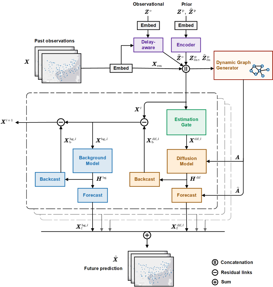 研究中所提出的闪烁预测模型架构如图1所示,该模型采用新颖的分解机制,将闪烁幅度S4指数分解为背景场和扰动场建模,并引入动态图生成器来构建观测数据的动态关系网络,使用一个编码器来聚合先验信息,以及通过一个延迟感知模块来建模闪烁与太阳辐射、地磁扰动等外部影响之间的时延效应。最后通过评估、对比、消融实验和可解释性分析,一致证明了所提出方法的有效性。